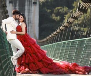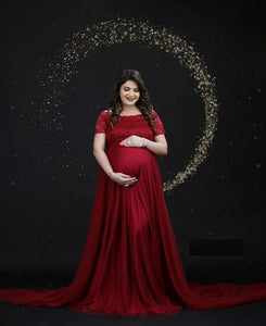 G437, Luxury Wine Red Lace Foral PreWedding Long trail Gowns, Size (XS-30 to L-38)