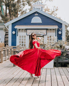 G130 (10), Wine Red Satin Off Shoulder Trail Ball gown, Size (XS-30 to XL-40)