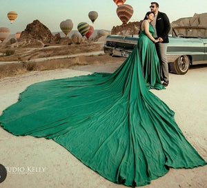 G3013, Castelon Green Satin Slit cut Pre Wedding Shoot Long Trail Gown, Size (All)pp