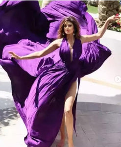 G906, Dark Purple Satin Slit Cut Long Trail Shoot Gown, Size (All)