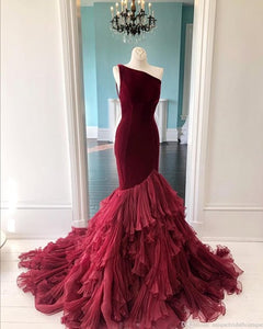 G113, Wine Red One Shoulder Layered Fish Cut Trail gown (SIZE ALL)