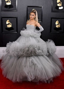 G787, Ariana Grande Dusty Grey Ruffled Long Trail Shoot Gown Size(ALL)pp
