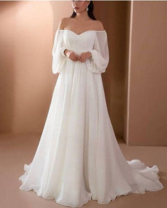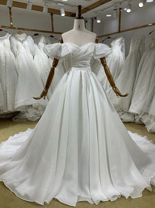 W160, White Satin Organza Ruffle Sleeves Wedding Trail Gown, Size (ALL)