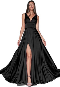 G250, Black Satin Slit Cut Evening Gown, Size (All)pp