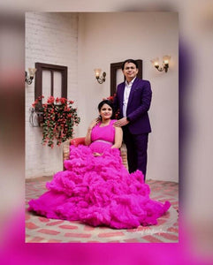 G1068 (2), Magenta Pink Slit Cut Ruffled Maternity Shoot Trail Gown With Inner, (All Sizes)