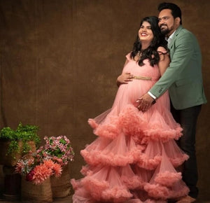 G652, Peach Ruffled Slit Cut Maternity Shoot Gown With Inner, Size(ALL)pp