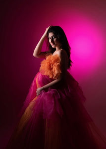 G1039 , Magenta and Mustard Twin Colour Slit Cut Maternity Shoot Gown, Size (All) pp