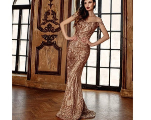 G153, Golden Sequin Mermaid Cocktail Evening Gown, Size (XS-30 to L-36)