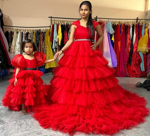 G4040 , Mother Daughter Red Ruffle Long Trail Shoot Gown, Size (All)p