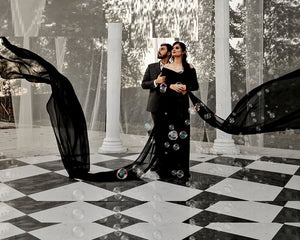 G501, Gerua Black Prewedding Shoot Infinity Long Trail Gown, (All Sizes)