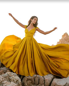 G278, Yellow Prewedding Shoot Satin Infinity Long Trail Gown Size (All)