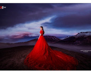 G129 (3), Red Offshoulder half sleeves Infinity Prewedding Shoot Trail Ball Gown, Size (XS-30 to L-38)