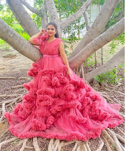 G1068 (2), Magenta Pink Slit Cut Ruffled Maternity Shoot Trail Gown With Inner, (All Sizes)