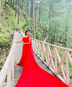 G217, Red Boat Neck Half Sleeves Long Trail Prewedding Gown Size, (XS-30 to L-38)
