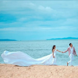 G224,Peach Satin Long Trail Prewedding Shoot Gown, Size(All)