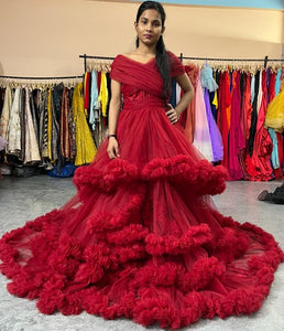 G968 ,Wine Slit Cut Puffy Frills Prewedding Trail Gown, (All Sizes)